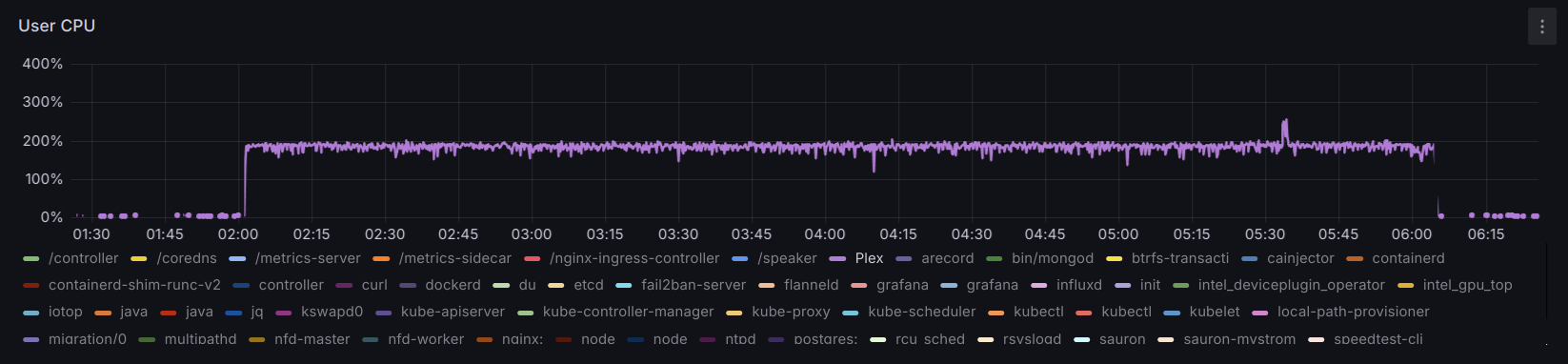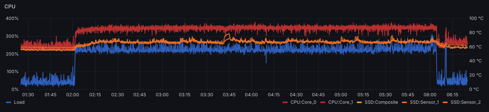 Normally Plex runs daily maintenance during the night, which is a good time. However, given the limited CPU in this server, even letting it run for 4 hours every day results in the CPU running quite hot for all that time: