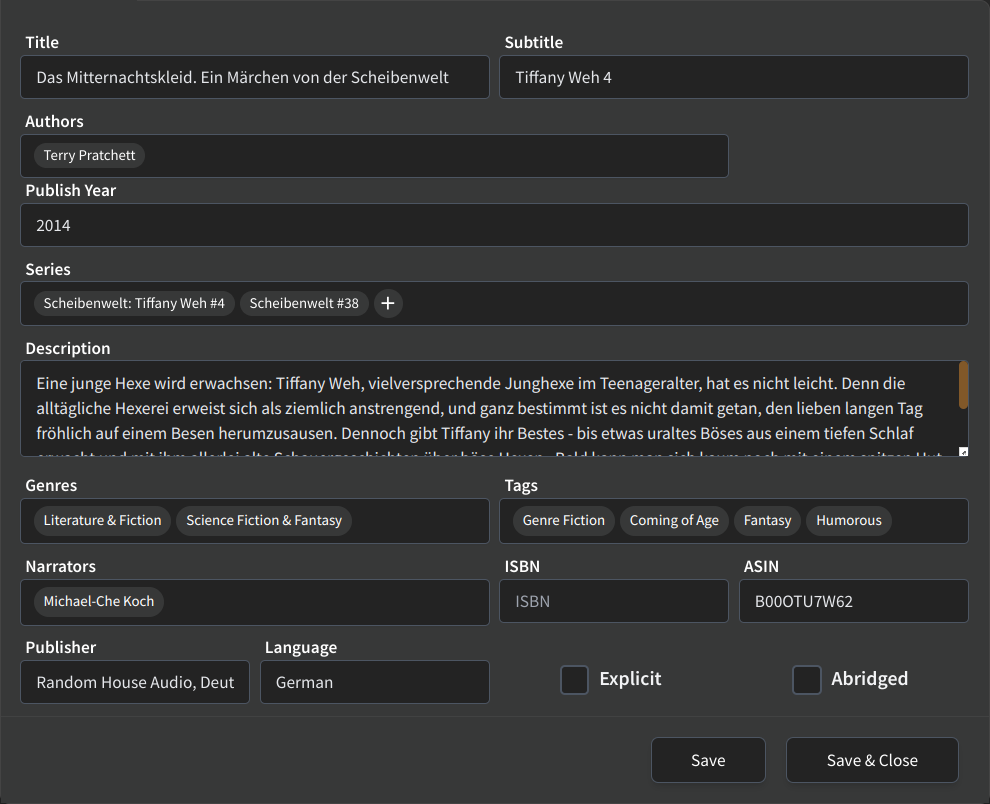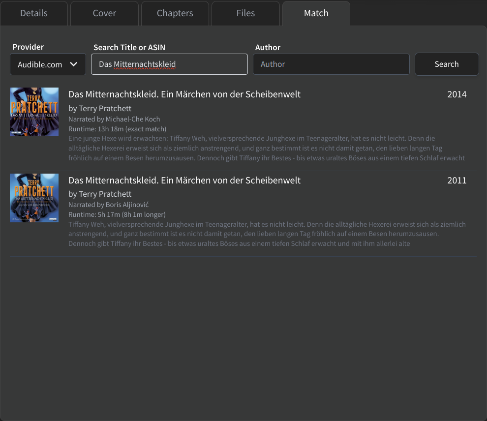 One of my favorite features of audiobookshelf is the ability to fetch book metadata and thus more clearly tell different versions of a book a part, e.g. abridged vs unabridged: