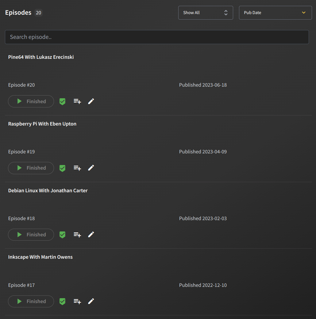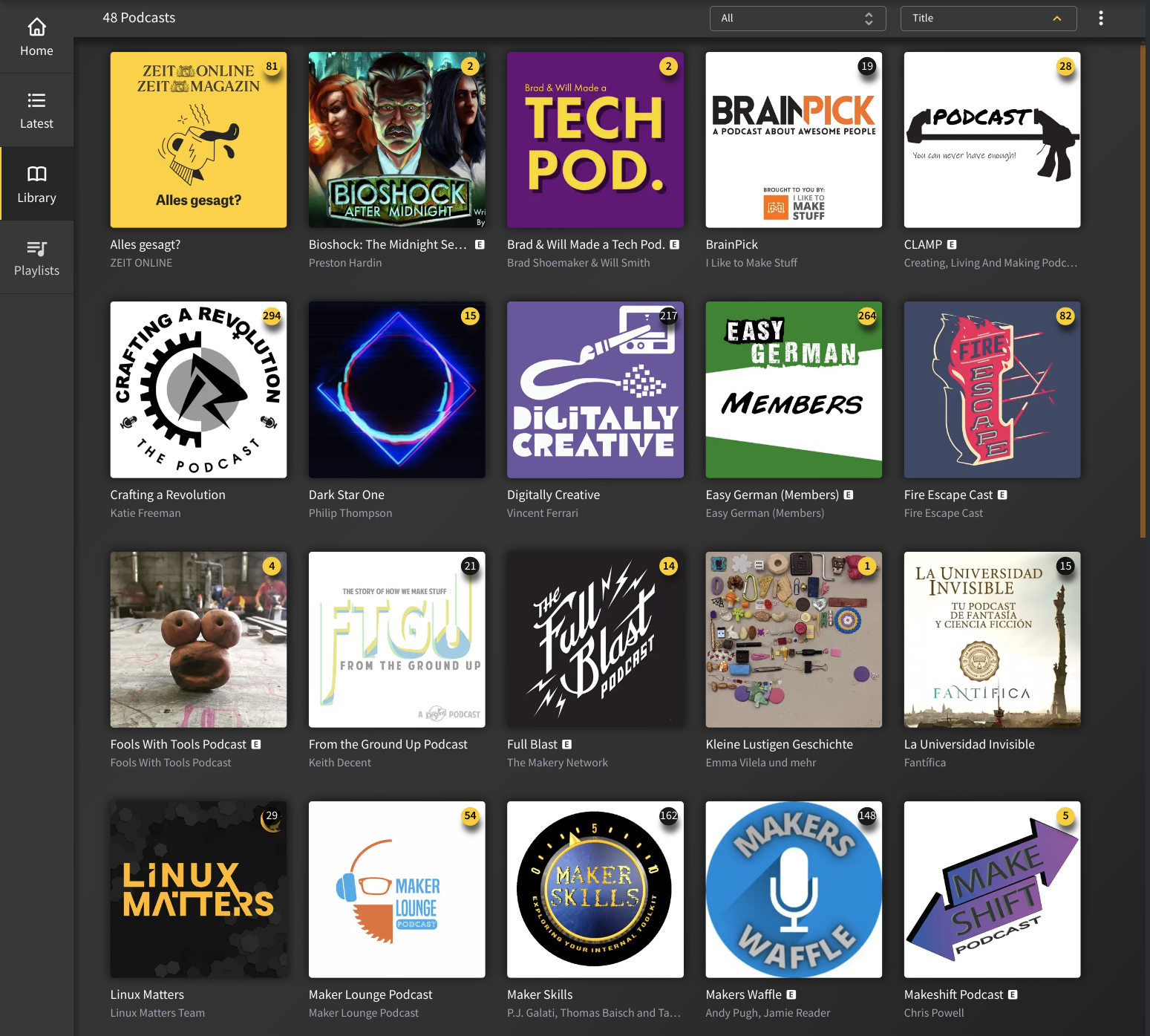 Just like with Audiobooks, keep track of which podcasts episodes each user has listed to is a central feature. One little detail I really like about how this is done, is the yellow or black circle on the podcast cover indicating whether all episodes have been listed to already (black circle) or otherwise how many are yet to be listened to (yellow circle):