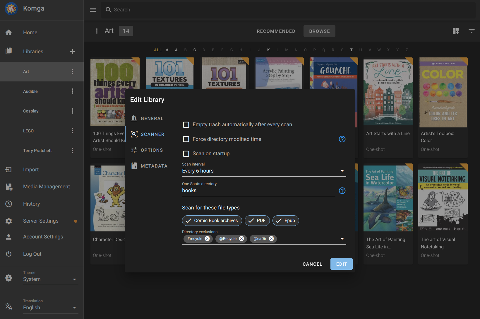 All individual books are stored under a books subdirectory under each library directory, and then this name is set as the One-Shots directory for every library: