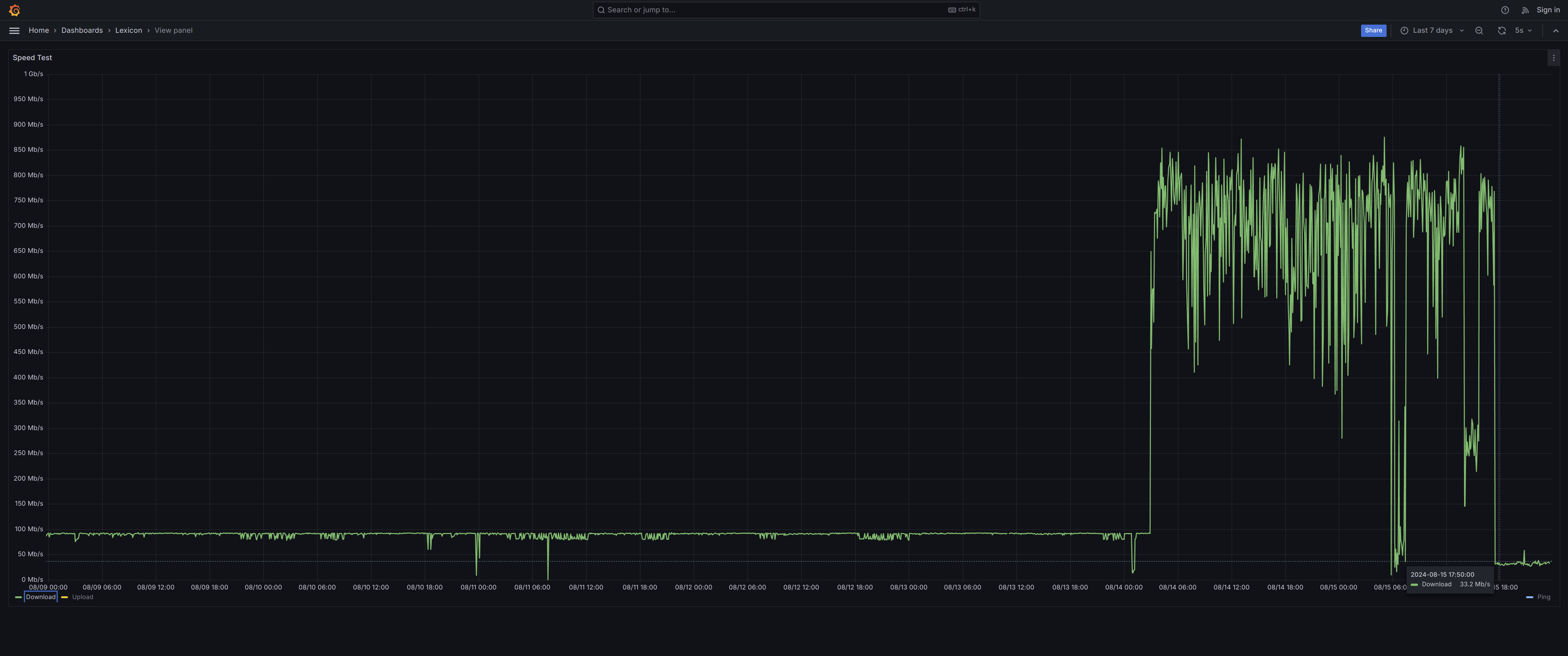 One day, completely out of nowhere, both download and upload speeds dropped to about 12 Mb/s flat, suggesting the speed was being throttled very much intentionally: