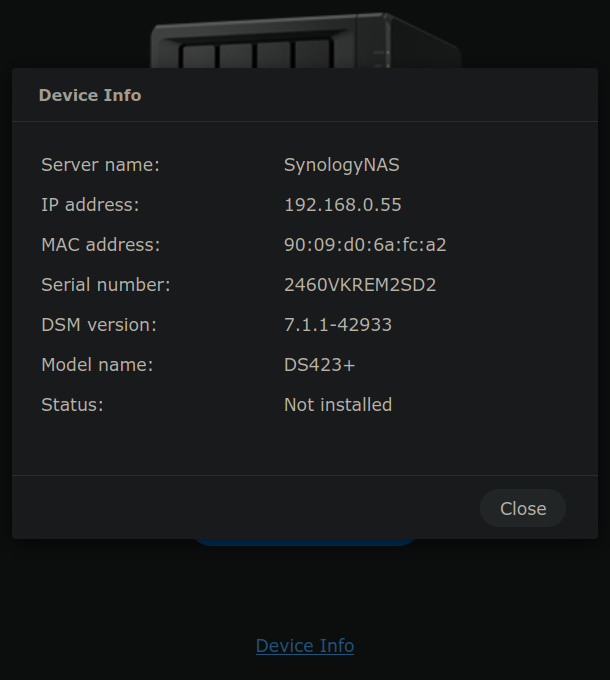 After checking Device Info, the first (apparently not optional) step is to upgrade the DSM software to the latest version, which as of now is Version: 7.2.2-72806 Update 3 from 2025-02-04. The update process takes up to 10 minutes to complete, in fact it finished in less than 5.
