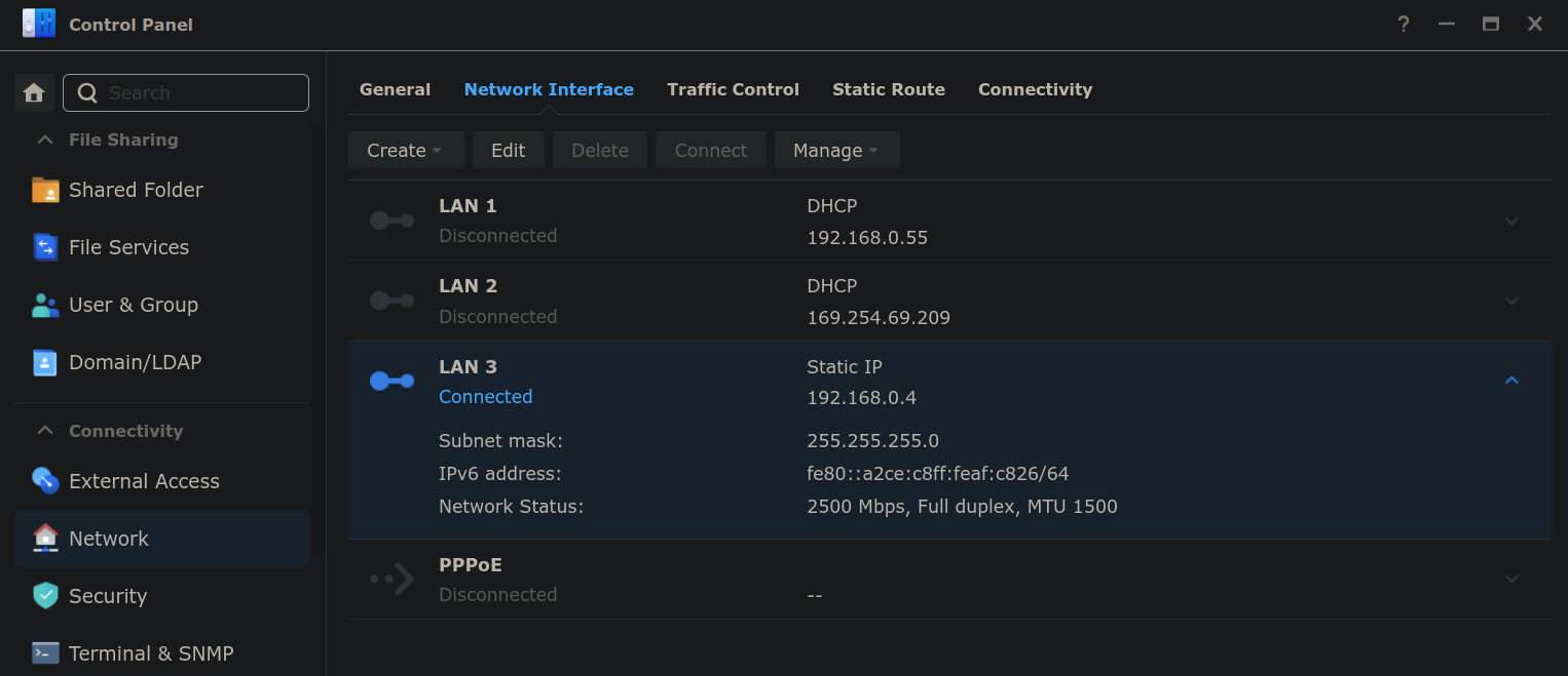 Rebooting the NAS was not possible because the recently created volume is still in the process of being optimized, but in any case the new RTL8152/RTL8153 driver is already running so we can already setup a static IP address on the new NIC under Network Interfaces in the Control panel, then switch the network cable to the new card (and update the PC's /etc/hosts to the static IP, if different), and after a few seconds the new card shows as Connected with a glorious 2500 Mbps: