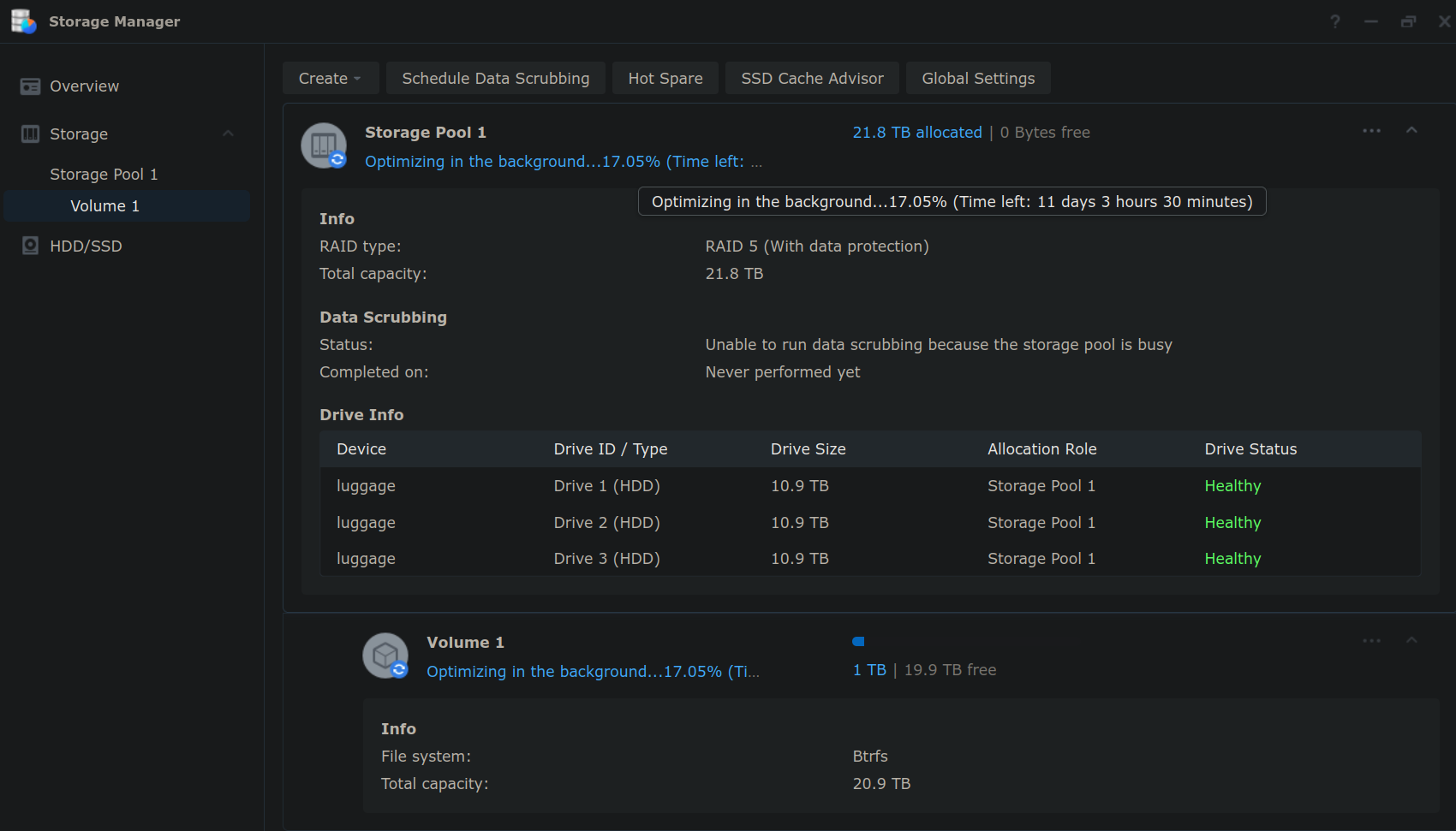 Create a RAID 5 volume with the 3 disks available; they show up with only 10.9TB of usage capacity, so the volume would have 21.8TB of capacity. Set the volume capacity to the Max value (22331 GB) and formated as Btrfs.