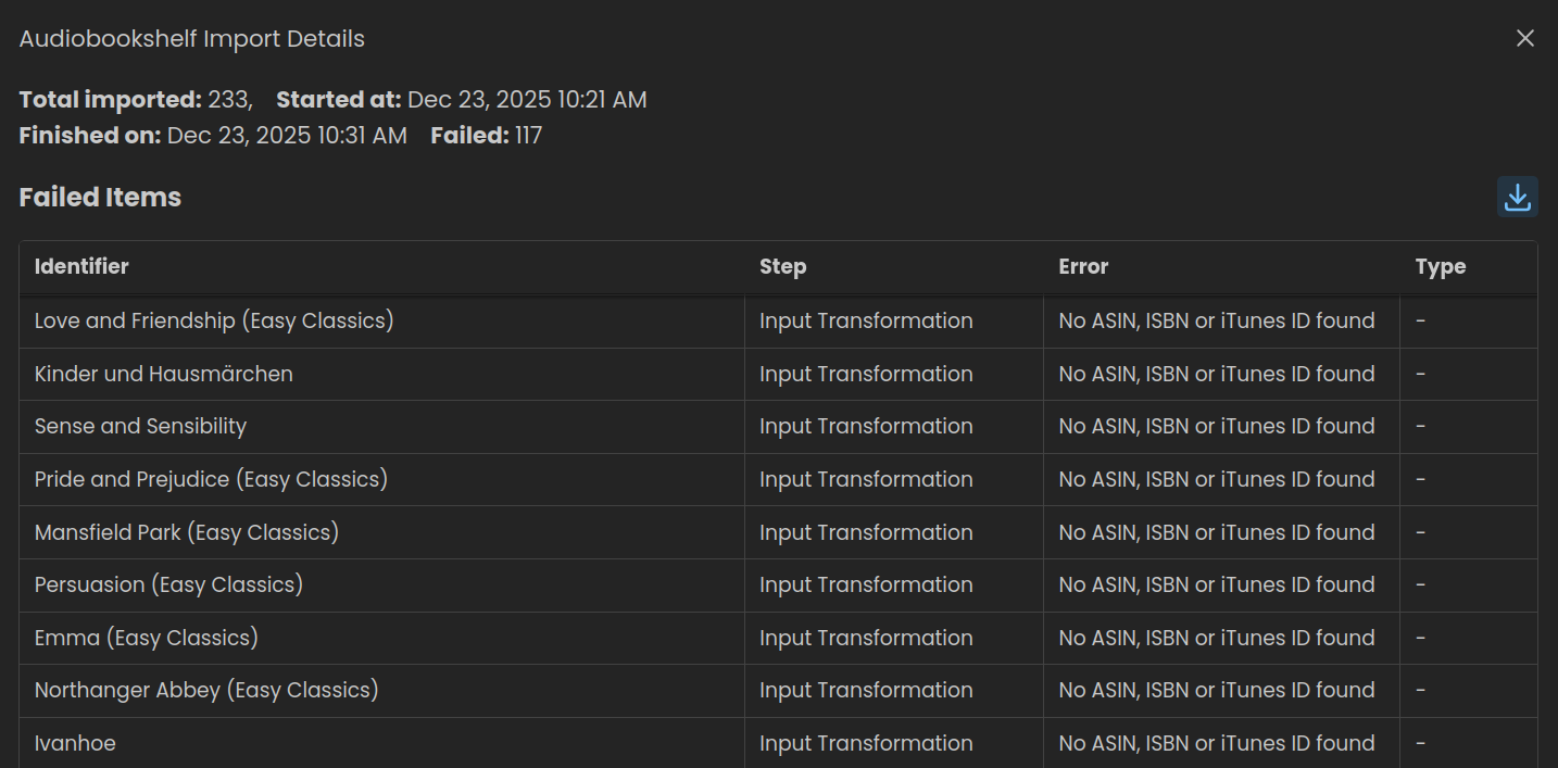This can be mitigated by adding ISBN or ASIN to those titles in Audiobookshelf, e.g. libro.fm and other stores may list ISBN and/or ASIN for audiobooks purchased offline. Audiobooks from librivox.org appear to have no ISBN or ASIN.